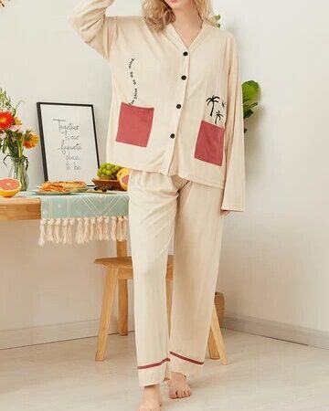 Women Letter Plant Pattern Button Front Ribbed Cotton Loungewear Pajamas Sets