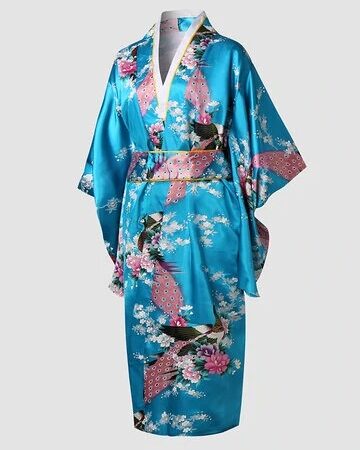 Women Japanese Style Peacock Print Bowknot Hook & Loop Smooth Luxury Robes